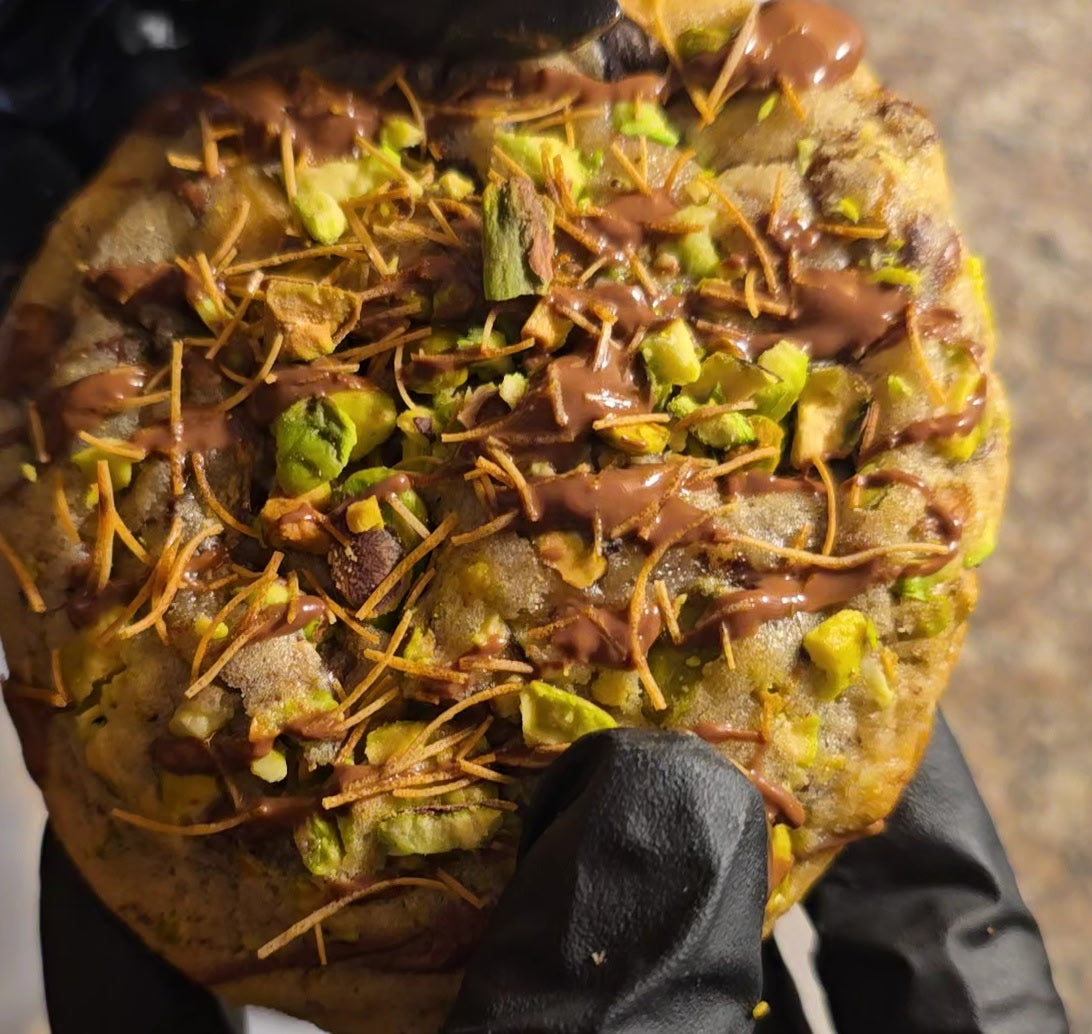 This artisanal cookie is infused with rich Dubai chocolate, offering a luxurious and decadent flavor profile. It’s topped with roasted pistachios and crispy vermicelli for a delightful crunch, all lightly drizzled with melted chocolate to enhance its indulgence.